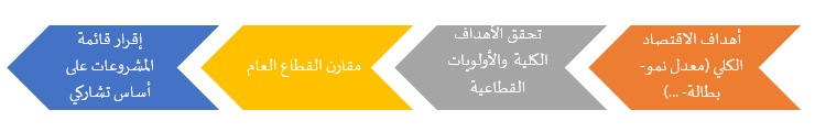 - إعداد مؤشر تفصيلي موسع من قبل الدولة بحيث يتضمن أهم الأهداف التنموية العامة للدولة والتي بناء عليها يمكن اتخاذ قرار طرح المشروع على أساس تشاركي وفق أسس موضوعية قائمة على تحقيق الأهداف الاقتصادية والاجتماعية لسورية.