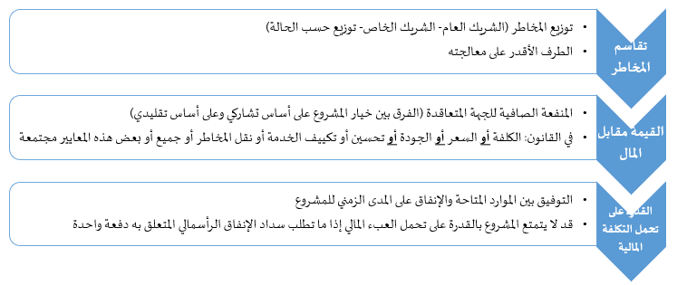- ما من نموذج وحيد يمكن نسخه وتطبيقه على القطاعات والمشروعات كافة، وإن خصائص بعض القطاعات ومدى التطور التكنولوجي ونوعية الخدمة لها دور في تحديد أسلوب وصيغة التعاقد.